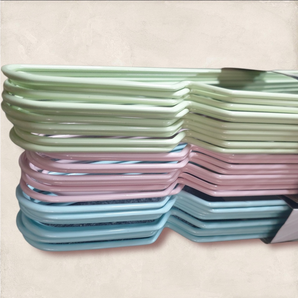 Hanger Baju Anak 1 Pack 10 pcs (Harga 1 Pack) Hanger yang bisa digunakan untuk menggantung pakaian dengan bahan berkualitas dan warna yang lucu. Dilapisi PVC agar baju anti slip