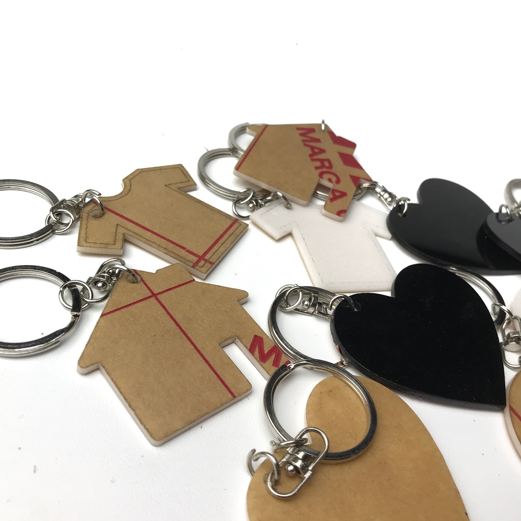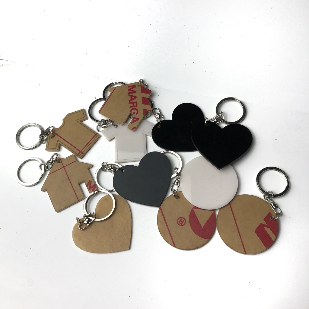 Terbuat dari bahan akrilik bening. Terdiri dari kait gantungan kunci dan bandul.