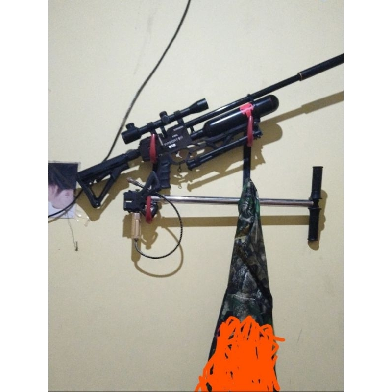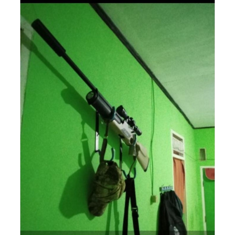 besi gantungan senapan angin berfungsi untuk menggantung senapan di dinding agar tertata lebih rapih dan indah untuk di pandang, juga untuk menghindari dari jangkauan anak anak. karena sangat berbahaya, jika di salah gunakan gantungan ini bisa di gunakan di segala jenis senapan angin, maupun senapan pcp,, airsoft gun dll
