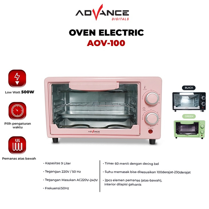 Fitur: Product Description Advance Electric Oven (Oven Listrik ) AOV-100 Kapasitas 9L Garansi Resmi Advance 1 Tahun TEMPERATUR CONTROL HINGGA 250C, Dilengkapi dengan tombol temperature control yang dapat diatur hingga 250 C. Putar tombol searah jarum jam untuk mengatur temperature saat digunakan untuk memasak. TIMER ( PENGATUR WAKTU OTOMATIS), Semua proses memasak anda akan jadi lebih mudah. Anda dapat mengatur penggunaan timer dalam jangka waktu maksimum 60 menit. Putar tombol searah jarum jam untuk mengatur waktu memasak. DILENGKAPI DENGAN NAMPAN, Untuk membantu proses memanggang agar lebih efisien dan maksimal. MUDAH PENGAMBILAN NAMPAN, Saat tu oven dibuka maka otomatis rak nampan ikut keluar, sehingga mudah dalam pengambilan nampan. KUE SEHAT, Oven ini dirancang menjaga aroma dan kualitas kue yang dihasilkan.