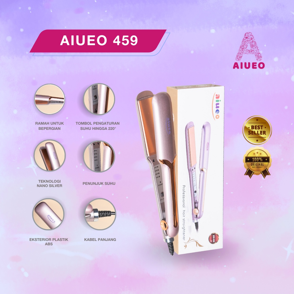 Catokan rambut revolusioner merk AIUEO 459 Mengandung komponen pemanas PCT di mana waktu yg diperlukan untuk panas singkat . Mesin awet & performa stabil. Dgn casing alumunium membuat rambut menjadi lembut, wajah semakin cantik dan tidak ada efek samping . Kabel bisa diputar, harga sangat murah tetapi kualitas luar biasa. suhu dari 160'-220'C. catok ini bisa untuk lurus dan keriting. Ada pengatur suhunya juga