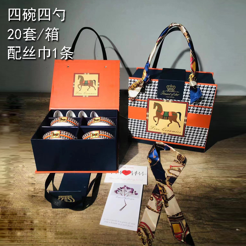 Detail (GARANSI PECAH) mangkok set keramik tebal dan mewah cocok buat hamper udah termasuk box Motif kuda