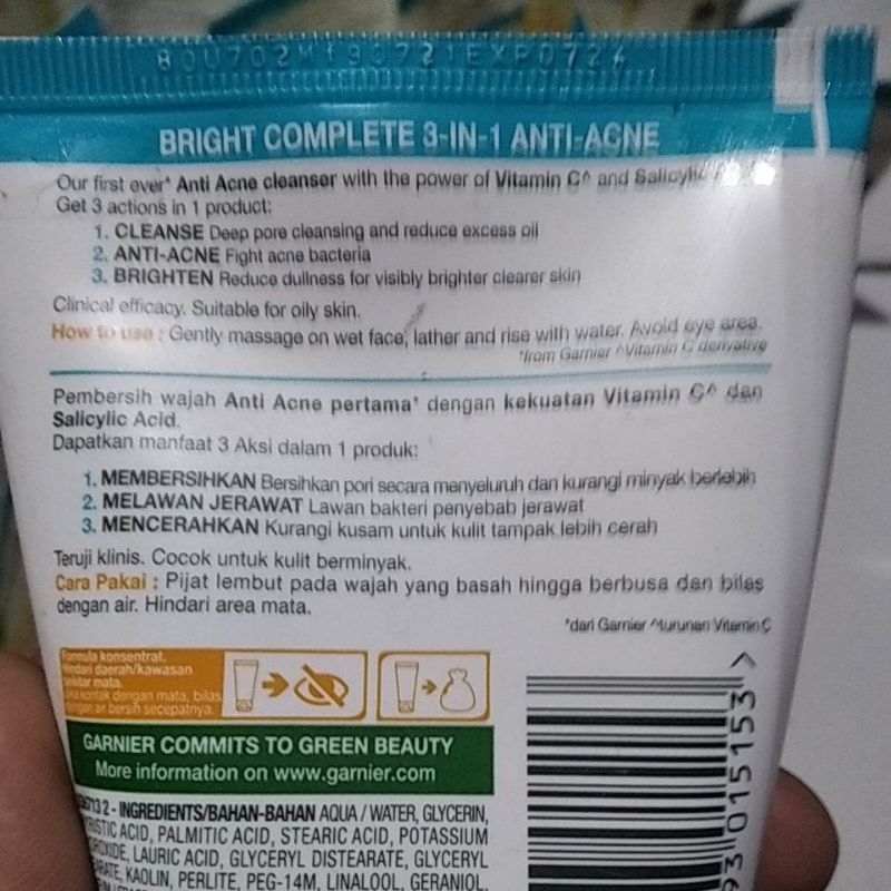 Garnier Bright Complete 3-In-1 Anti Acne adalah pembersih wajah Anti Acne pertama dengan kekuatan Vitamin C dan Salicylic Acid. Dapatkan manfaat e aksi dalam 1 produk :