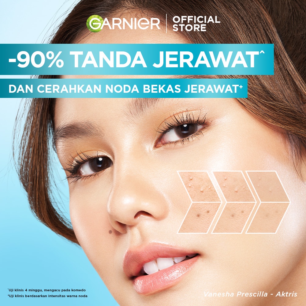 BARU! Garnier Bright Complete Anti-Acne Booster Serum! Telah teruji secara klinis dengan 4%* kombinasi dari Vitamin C^ yang dikenal dapat mencerahkan dan menyamarkan tampilan noda hitam + Salicylic Acid yang dapat melawan jerawat dan pori tersumbat + Niacinamide yang dikenal dapat menyejukkan kulit + AHA yang dapat menyamarkan noda jerawat, membuat kulit terasa lebih halus.