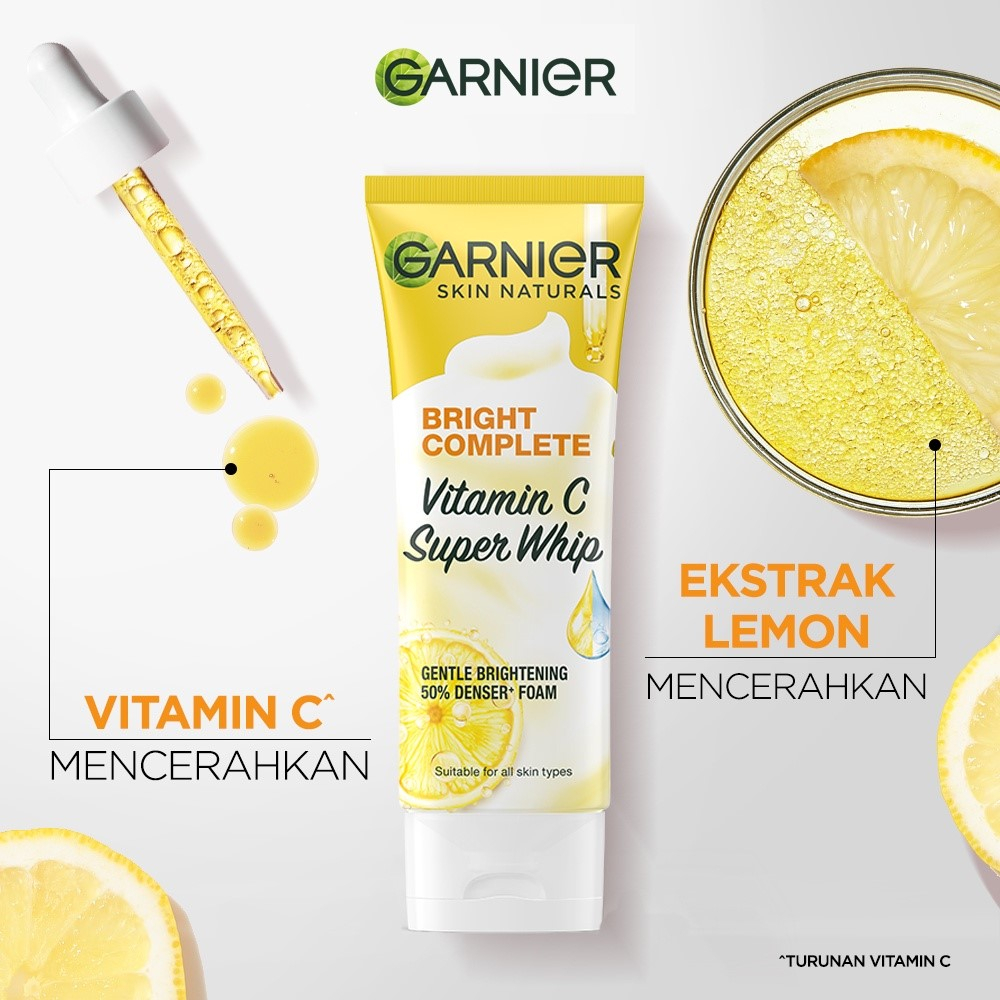 GARNIER Bright Complete Vitamin C Super Whip Foam BARU! Diperkaya dengan Lemon dan Vitamin C^ yang mencerahkan, Garnier Bright Complete Vitamin C Super Whip memiliki busa yang lebih padat hingga 50%+ untuk membersihkan dengan lembut, mengurangi kusam tanpa membuat kulit kering. Tidak kusam, tidak terasa kaku, terasa lembut, dan tampak cerah setelah penggunaan pertama*! Cara Pakai: Pada telapak tangan yang basah, keluarkan produk secukupnya (kurang lebih 2 cm). Busakan di telapak tangan dengan gerakan memutar, tambahkan sedikit air secara berkala untuk membuat busa yang lebih padat. Pijat lembut pada wajah dan bilas dengan air. Hindari area mata. ^Turunan Vitamin C *uji konsumen pada 400 subjek +berdasarkan uji instrumen vs Garnier Matcha Gel Wash Kandungan: AQUA / WATER, SORBITOL, LAURIC ACID, STEARIC ACID, MYRISTIC ACID, POTASSIUM HYDROXIDE, GLYCOL DISTEARATE, PALMITIC ACID, KAOLIN, SODIUM COCOAMPHOACETATE, COCO-BETAINE, LINALOOL, SODIUM CHLORIDE, SALICYLIC ACID, SODIUM BENZOATE, PHENOXYETHANOL, DISODIUM, EDTA, LIMONENE, ASCORBYL GLUCOSIDE, CITRUS, LIMON FRUIT EXTRACT / LEMON FRUIT EXTRACT, HYDROXYPROPYL METHYLCELLULOSE, POLYQUATERNIUM-7, BENZYL SALICYLATE, BENZYL, ALCOHOL, CI 19140 / YELLOW 5, PARFUM / FRAGRANCE.
