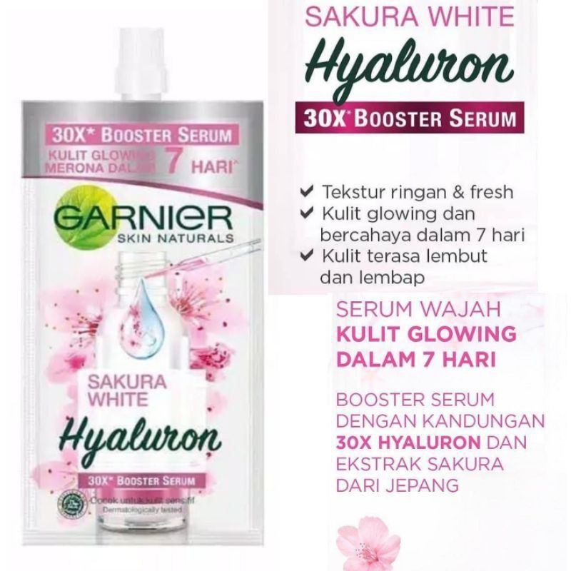 Sakura White Hyaluron 30x Booster Serum Inovasi baru dari Garnier Sakura White Booster Serum dengan kandungan formula pelembabtertinggi dari 30x Hyaluron dan Ekstrak Sakura.Formula serum yang cepat meresap bekerja ke dalam lapisan kulit untuk melembabkan sel kulit demi hasil cerah merona alami.Dari penggunaan pertama kulit terasa halus,lembab dan tampak cerah.Setelah satu minggu dapatkan kulit tampak cerah glowing merona seperti wanita korea.