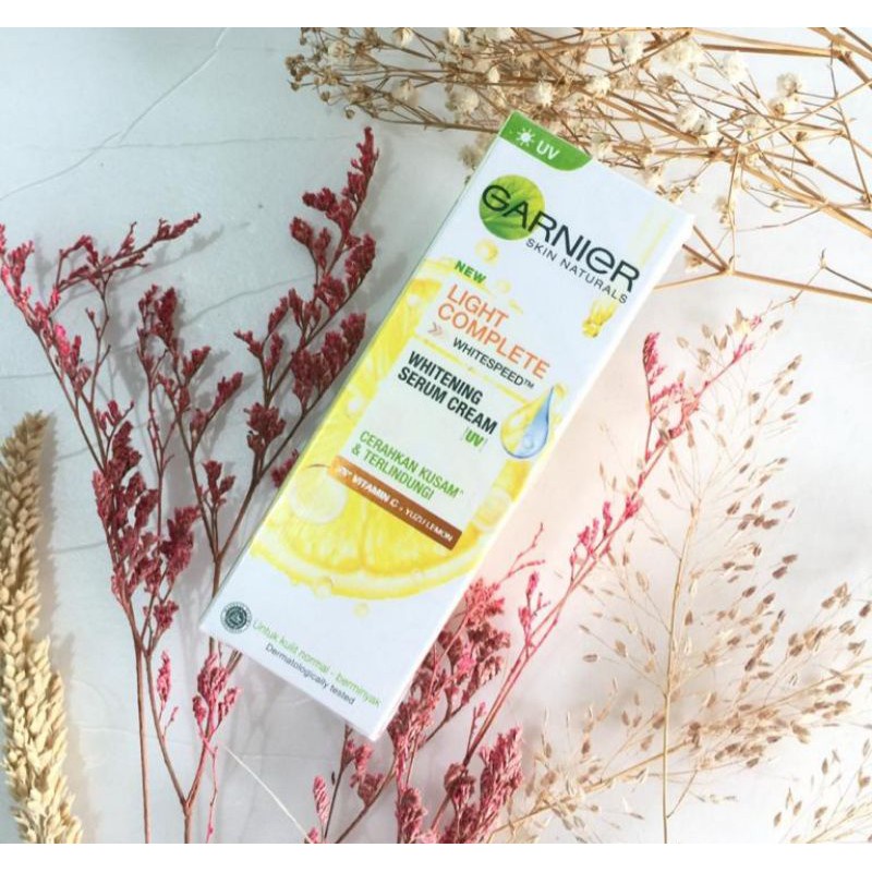 LIGHT COMPLETE SERUM CREAM UV Inovasi baru Garnier Light Complete WhiteSpeedTM Serum Cream UV. Diperkaya dengan 3X Vitamin C* paling tinggi**, Buah Lemon Yuzu segar dari Jepang yang mencerahkan, Salicylic Acid derivative & UV filters. Formula yang ringan cocok untuk kulit normal cenderung berminyak. Dengan 3 aksi mencerahkan: - CERAHKAN kulit - SAMARKAN noda hitam & bekas jerawat - MELINDUNGI dari penggelapan kulit karena sinar UV Dapatkan kulit tampak hingga 3 tingkat lebih cerah^ & 12 jam tanpa kilap^^. Sesuai untuk kulit Wanita Asia. Hasil: Kulit tampak lebih cerah, tanpa kusam dan minyak berlebih, noda hitam & bekas jerawat tersamarkan. Cara pakai: Aplikasikan secara merata pada waj & leher yang telah dibersihkan. Hindari daerah sekitar mata