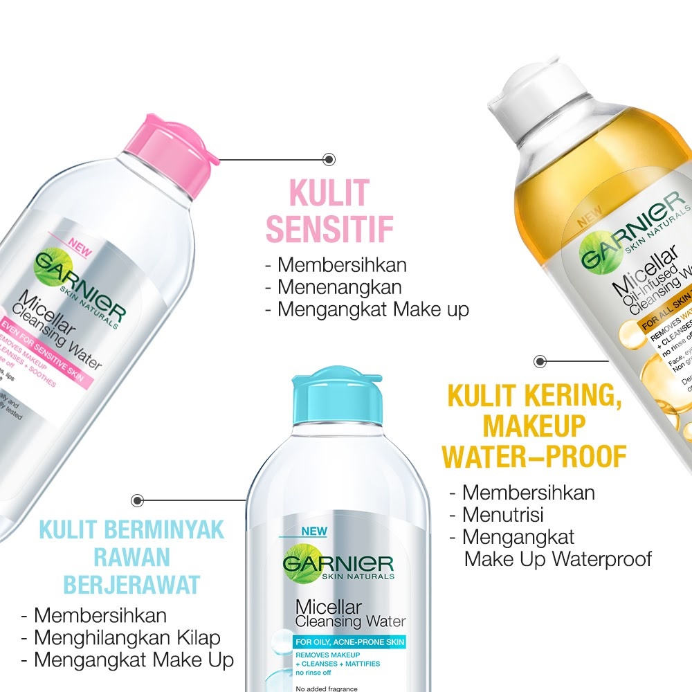 Garnier Oil-Infused Micellar Cleansing Water, secara optimal mengangkat make up water proof. Formulanya memungkinkan micelles untuk mengangkat sisa make up seperti magnet dan minyak argan merawat dan menutrisi kulit wajah.