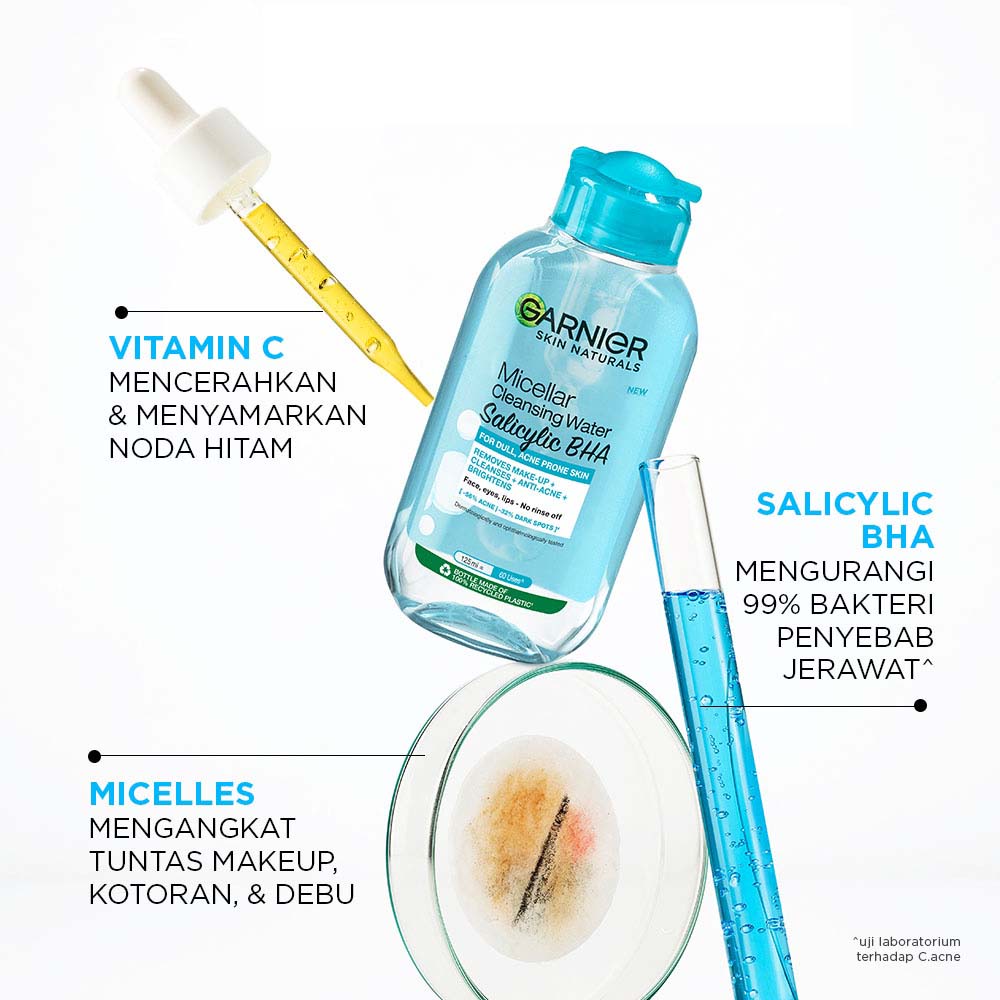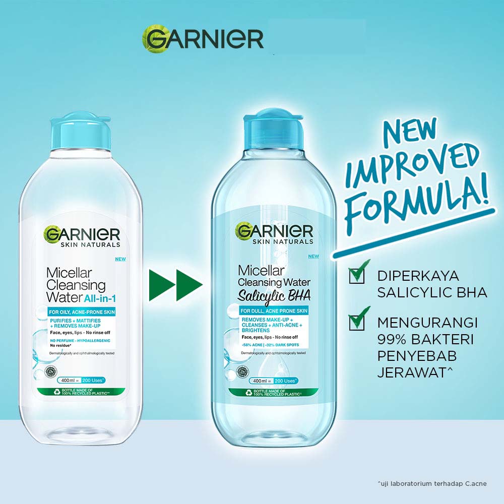 Garnier Micellar Cleansing Water, diperkaya dengan Micelles, dapat mengikat dan mengangkat debu, kotoran, juga make-up dari wajah, mata, dan bibir. Tektsturnya ringan seperti air, sehingga dapat menghilangkan kotoran dan make-up dari wajah secara lembut tanpa perlu dibilas.Formulanya tidak lengket di wajah, tidak berminyak, dan tanpa parfum: cocok untuk semua jenis kulit termasuk kulit sensitif.