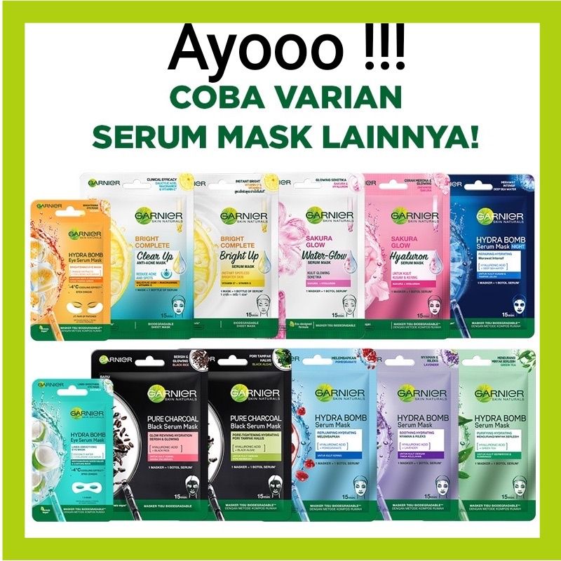 Garnier sheet mask berbagai varian light complete/ sakura white/ sakura glow/ bright up/ green tea/ algae/ hydra bomb mask