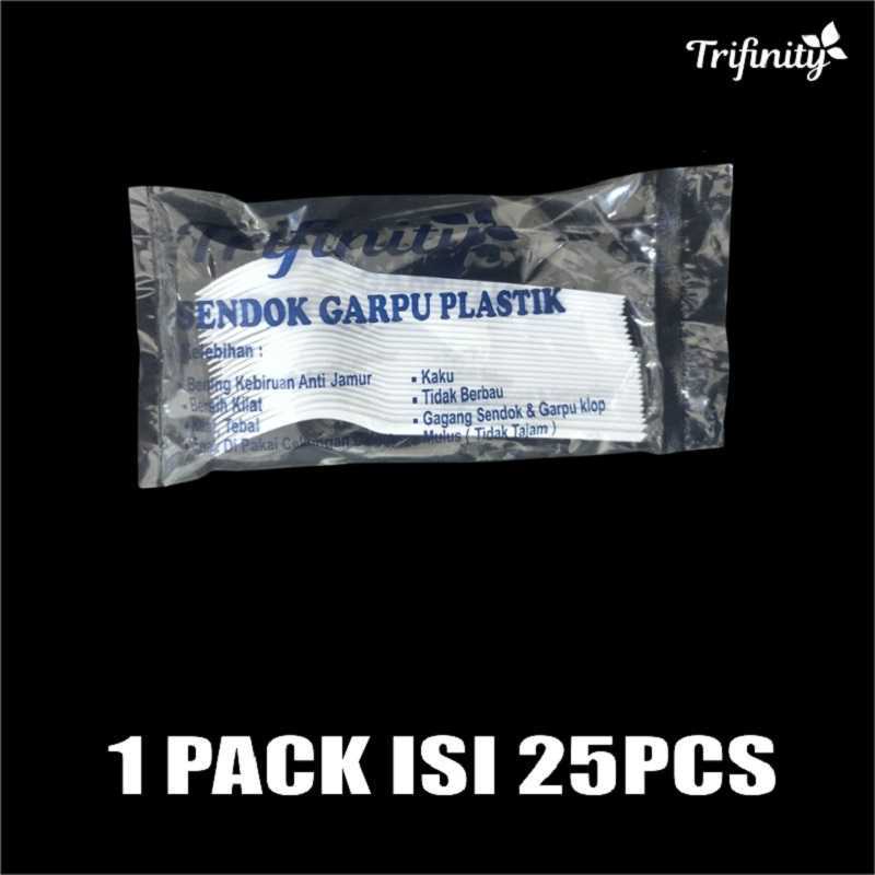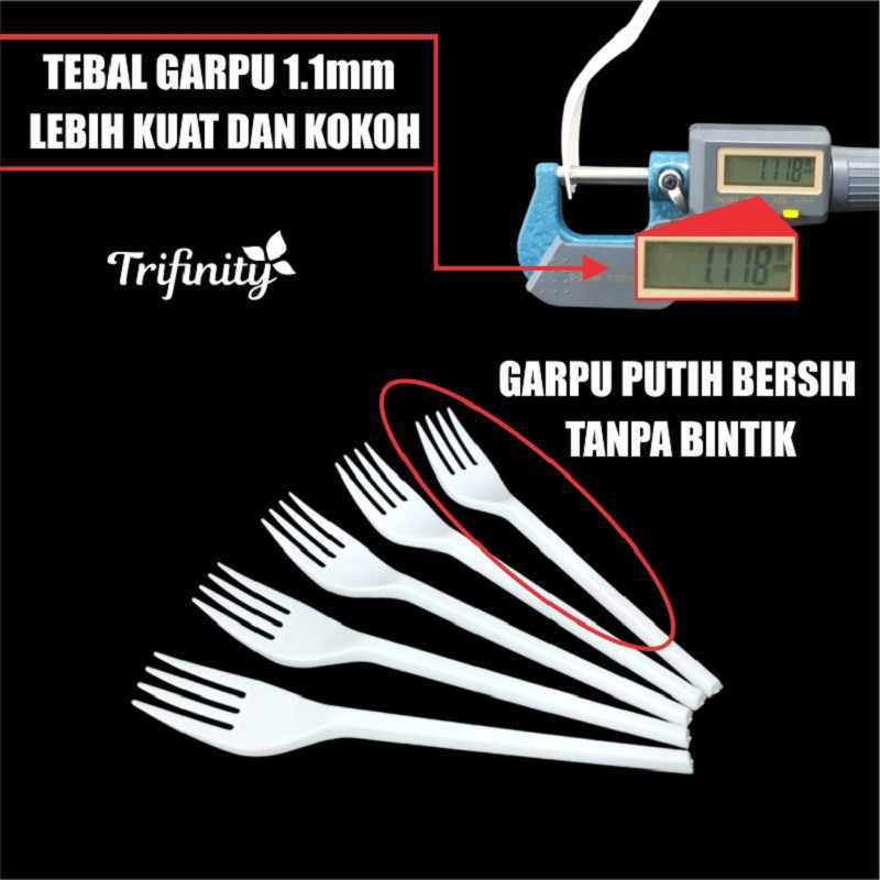 Spesifikasi : Bahan PS lebih kaku Warna Putih Cemerlang Kilat Bersih tanpa bintik kotor Tidak berbau Tahan Panas Anti Kusam Garpu makan plastik putih bersih Merk trifinity