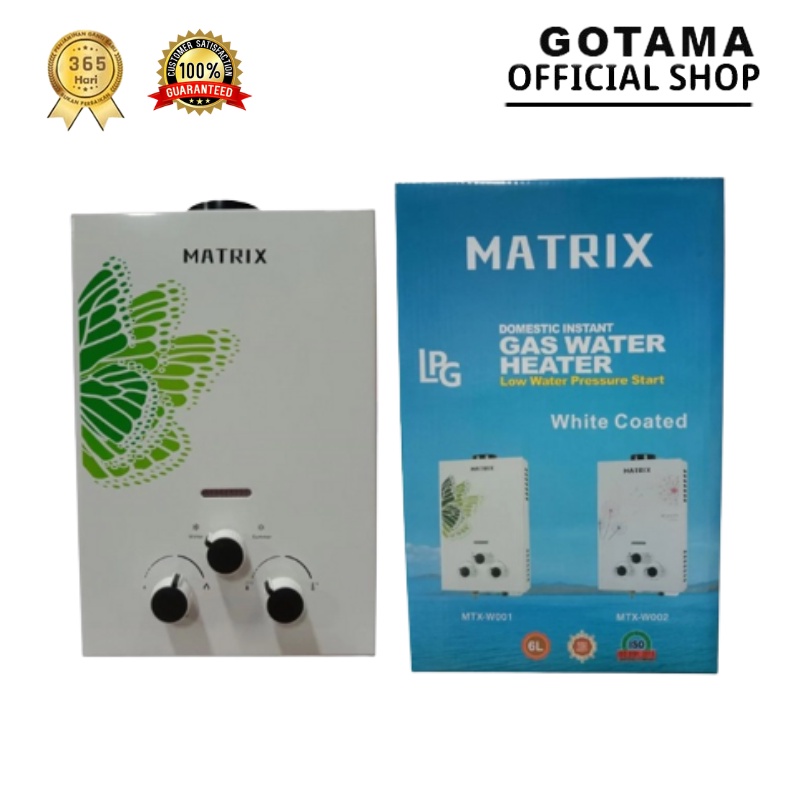 Matrix MTX-W001 Gas Water Heater merupakan pemanas air yang menggunakan gas LPG dengan kapasitas 6 Liter, tekanan gas 2800 Pa/LPG, dan tanpa tekanan air. Dimensi 335x170x520 mm. Berat bersih 5 Kg dan berat kotor 5.6 Kg.