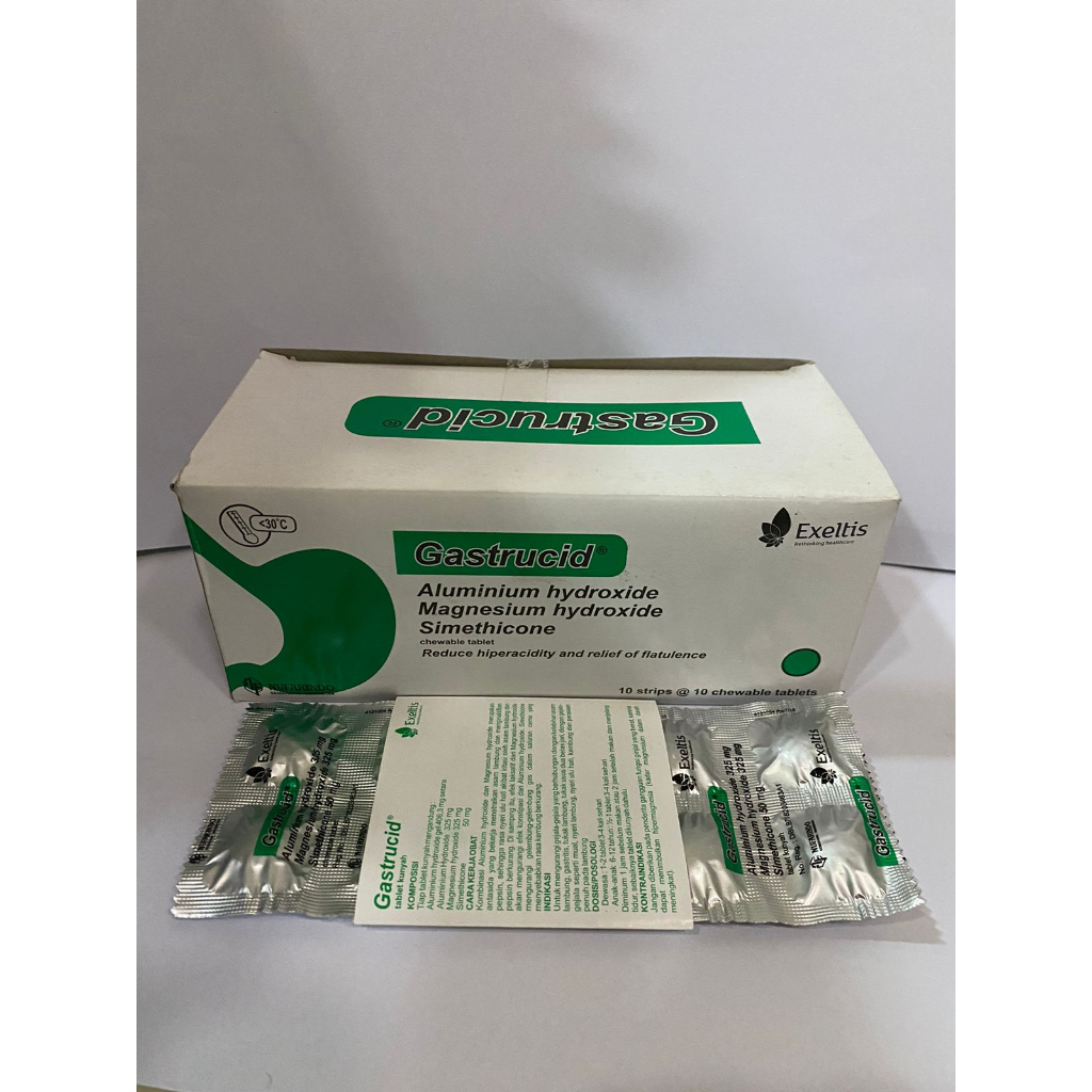 ndikasi Umum Sakit maag, Gastritis, Tukak lambung dan/atau usus halus, Esofagitis, Pirosis, Perut kembung Deskripsi GASTRUCID TABLET merupakan obat yang digunakan untuk mengatasi gangguan pada saluran pencernaan seperti gastritis, perut kembung, maag, dispepsia, hiatus hernia, tukak lambung dan usus duabelas jari. Dosis 3 x sehari 1-2 tablet kunyah Aturan Pakai 1 jam sesudah makan dan sebelum tidur malam, tablet dikunyah sampai halus sebelum ditelan Kemasan Strip @ 10 Tablet Kunyah