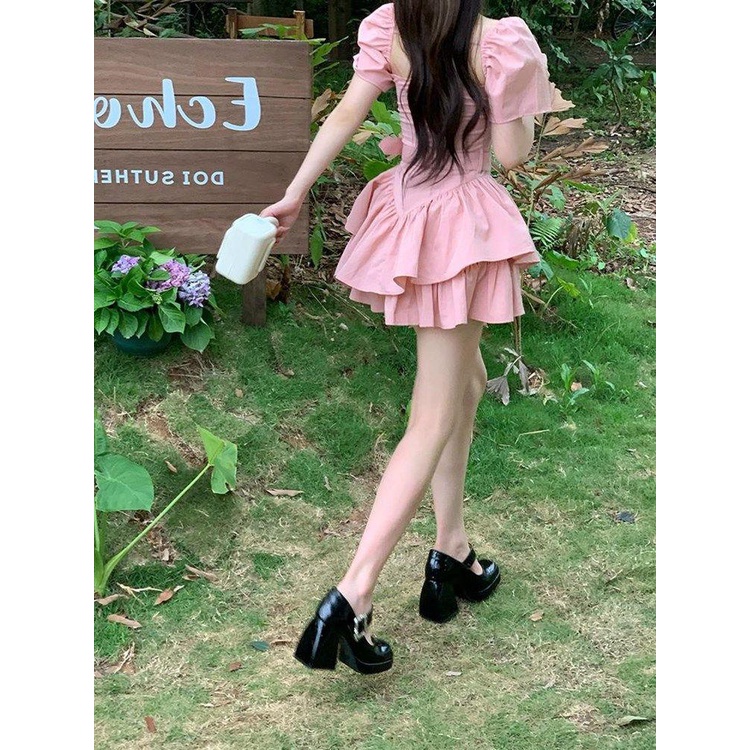Gaun Balet Manis Murni Gaya Feminin Wanita, Gaun Kue Kecil Kerah Persegi Lengan Puff Ketat Pinggan00