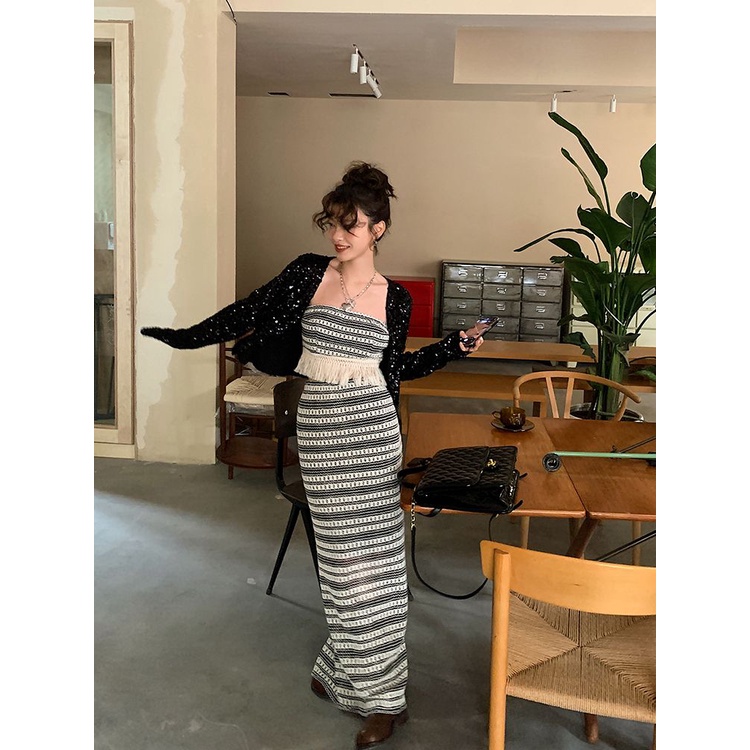 Detail Gaun dua potong rompi bustier bergaris hitam dan putih yang seksi untuk liburan