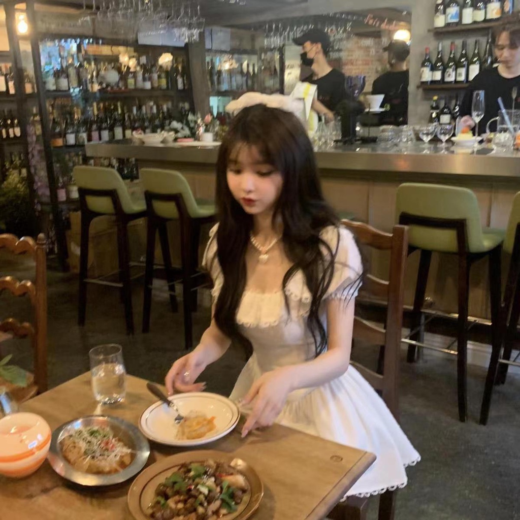 Detail Gaun Gaya Putih Murni Kerah Kotak Perancis Rok Putri Kecil Ketat Pinggang Cinta Pertama