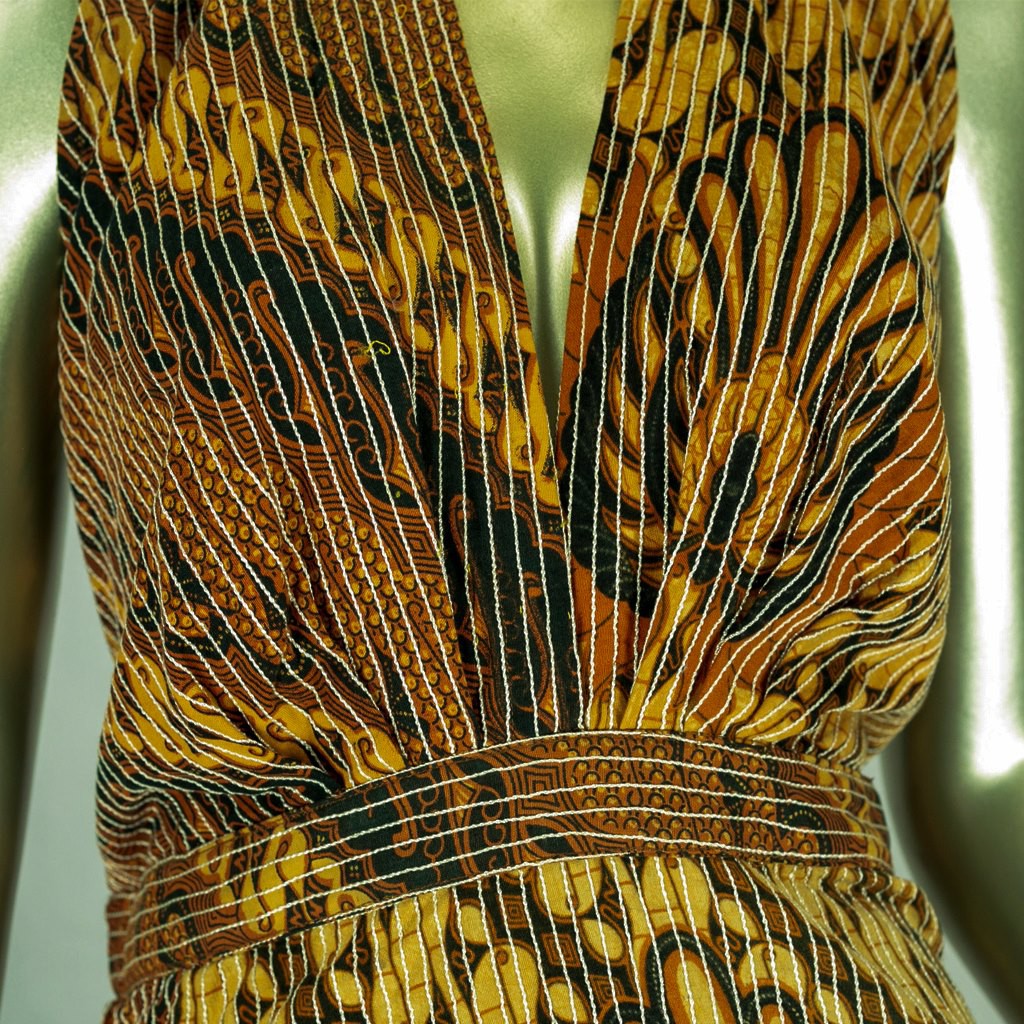 Detail GAUN MIDI WANITA DRESS BATIK LAWASAN APLIKASI BENANG TINDIS BACKLESS WARNA COKLAT