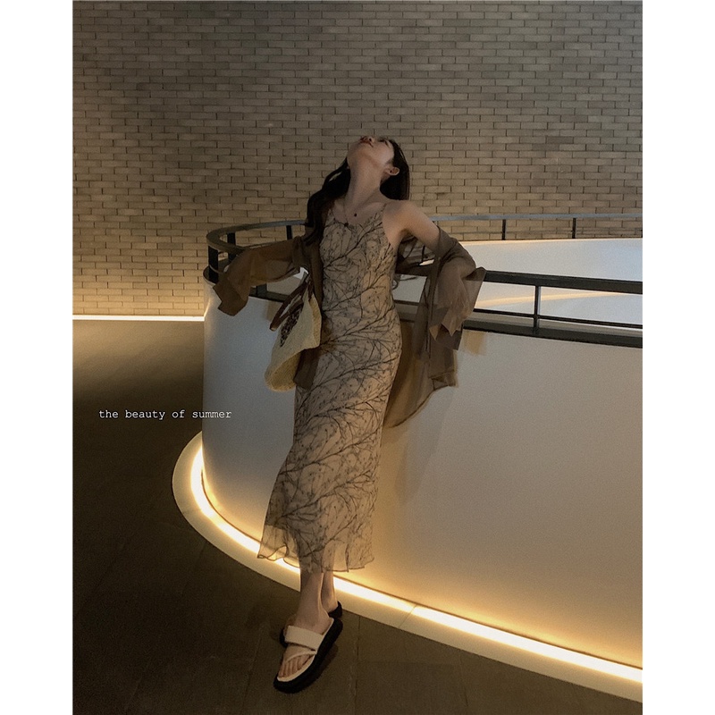 ↂ☽gaun musim panas baju pantai wanita dicetak suspender rok pinggang elegan musim semi longgar baju jaket dua potong set