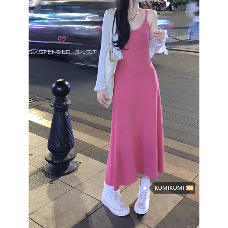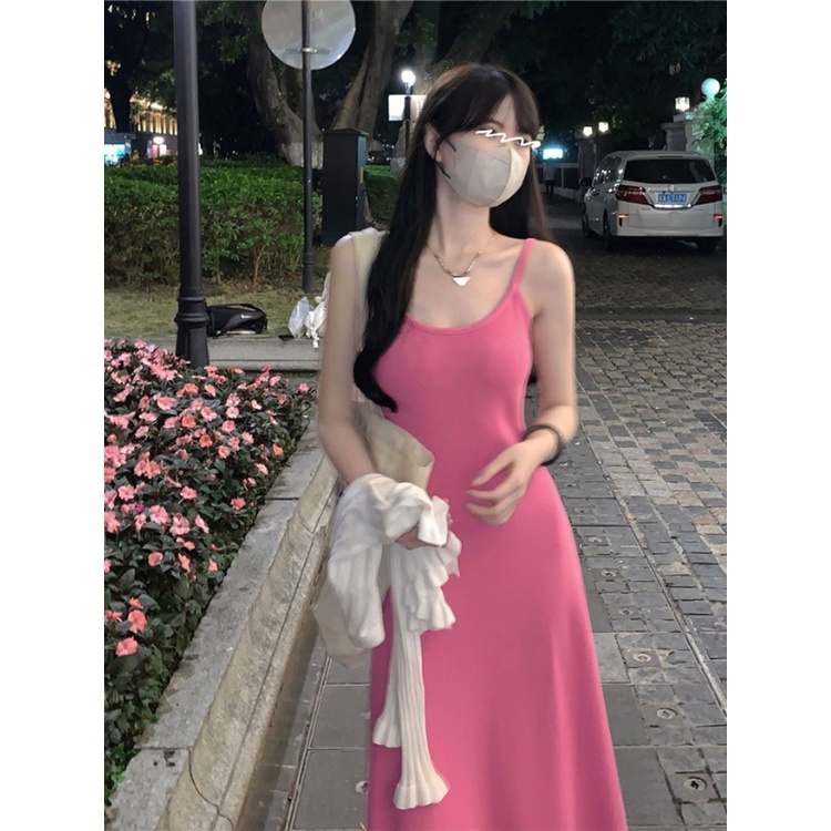 ◎∏Gaun Musim Panas Pantai Gaya Lembut Rajutan Suspender Rok Wanita Musim Panas Gaun Merah Muda Ceruk Pinggang A-line Rok Panjang Rok Bawah