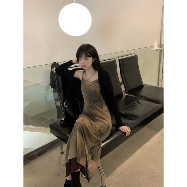﹊☍gaun musim panas pantai manis dan pedas angin goreng street suit suspender rok retro rok gaun musim panas wanita kardigan mantel top two-piece set