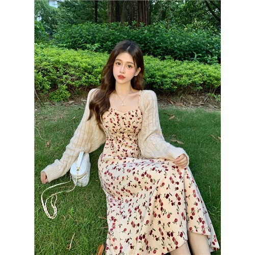 Pakaian Wanita > Denim > Dress Denim > ☎❦●Gaun Musim Panas Pantai Fashion Wanita Asing Gaya Rajutan Selendang Cardigan Musim Semi Lentera Tali Beludru Gaun Two-Piece Set