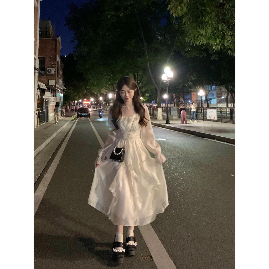 Detail Gaun Panjang Ketat Pinggang Musim Semi Gaun A-line Cinta Pertama Prancis Gaun Peri Rasa Mutiara Pale