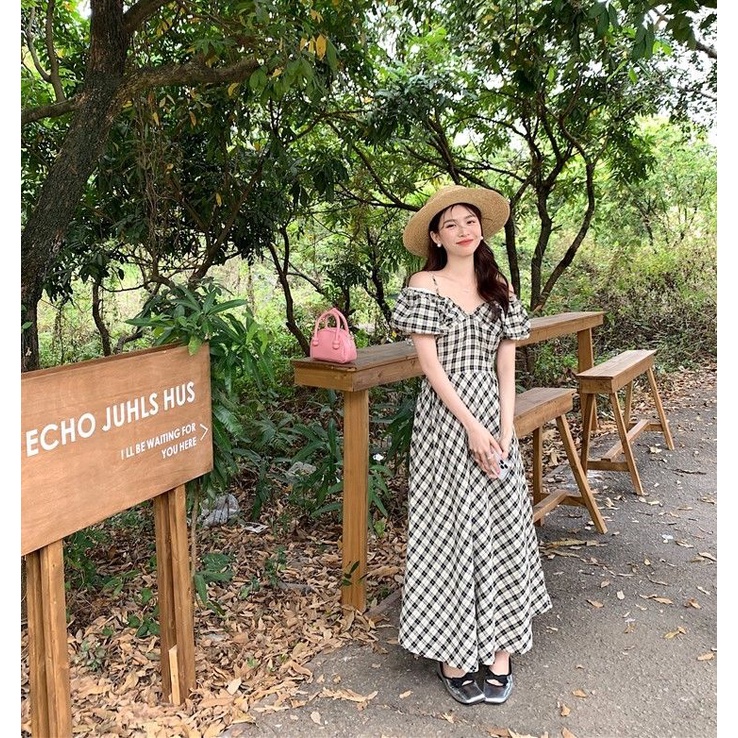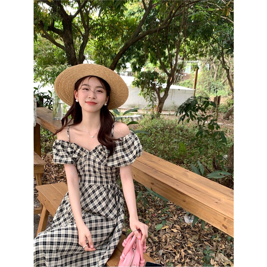 Detail Gaun Panjang Pertengahan Kotak-kotak Prancis Musim Panas Baru