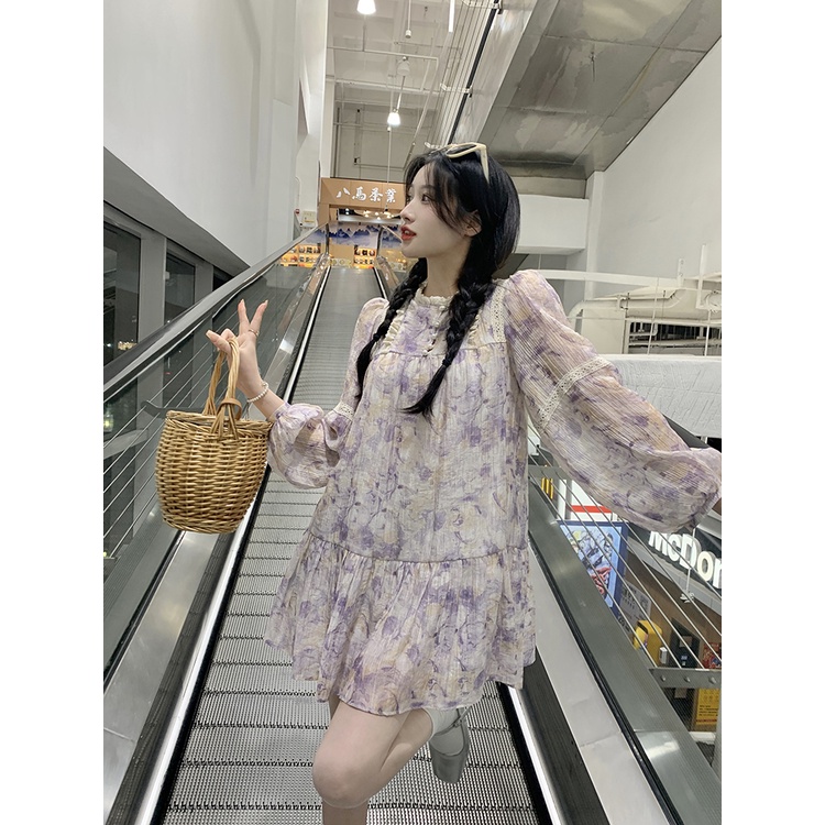 Pakaian Wanita > Denim > Dress Denim > №▪♧gaun pantai musim panas Prancis retro renda jahitan lengan panjang gaun bunga gaun musim panas wanita ceruk rok a-line gaya lembut