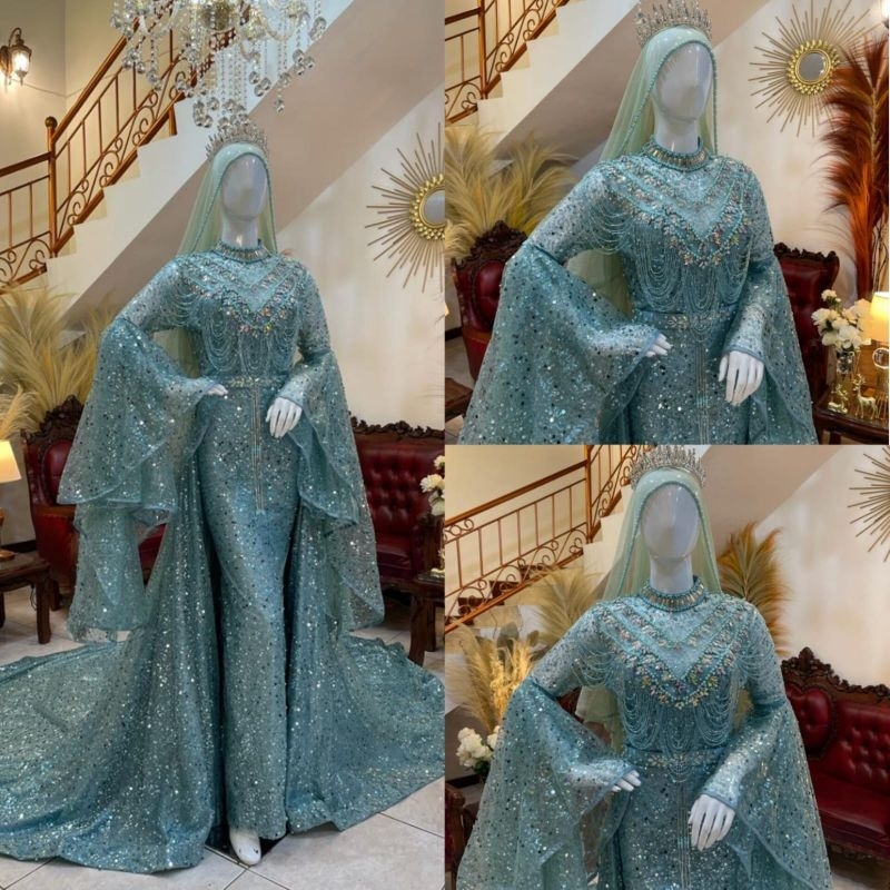 Reall picture 📷 gaun pengantin span bahan Squen premium lengan trompet terbaru, ekor bisa lepas pasang ukuran All Size Ld 100 cm Include gaun ,lengan trompet, ,krudung dan manset spandex.