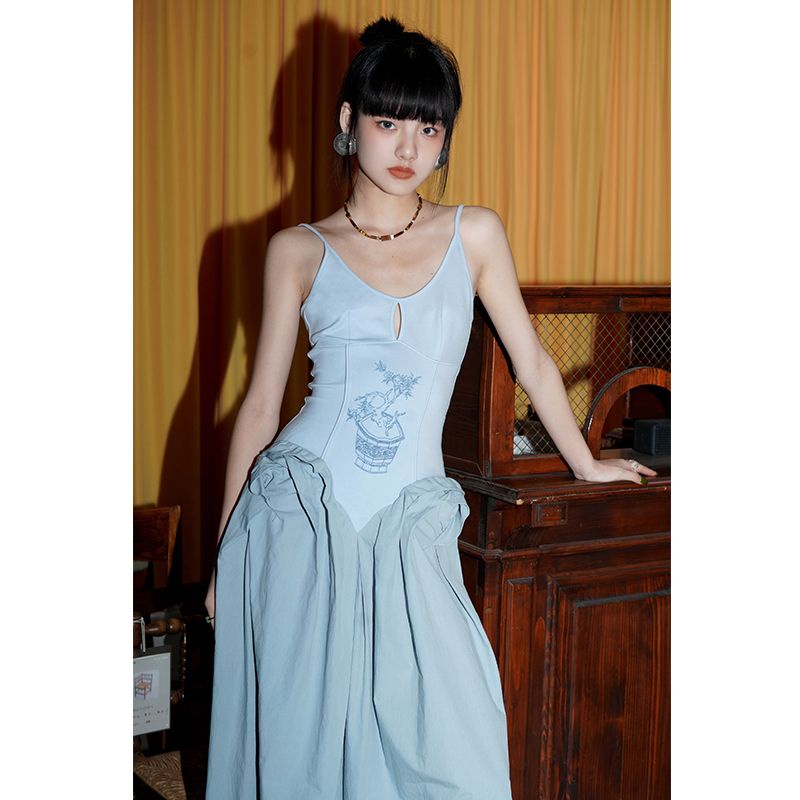 Detail Gaun Potongan Berdiri Pinggang Ketat Wanita, Gaun Tali Spaghetti Retro Tepi Laut Gaya China Baru mid
