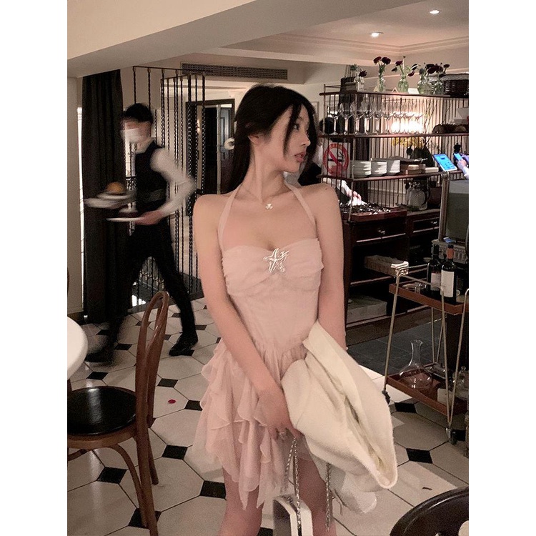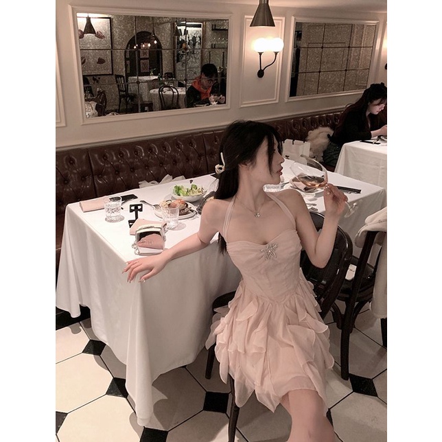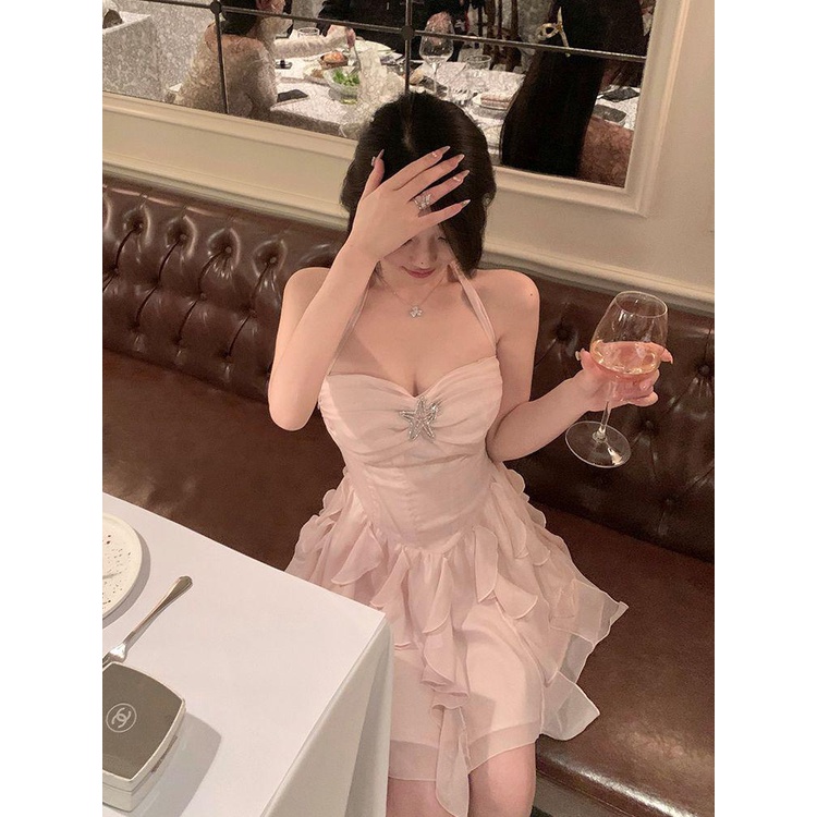Gaun Ruffle Pendek Wanita, Gaun Halter Lembut Industri Berat, Mewah Ringan
