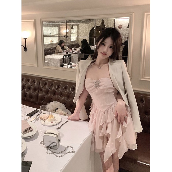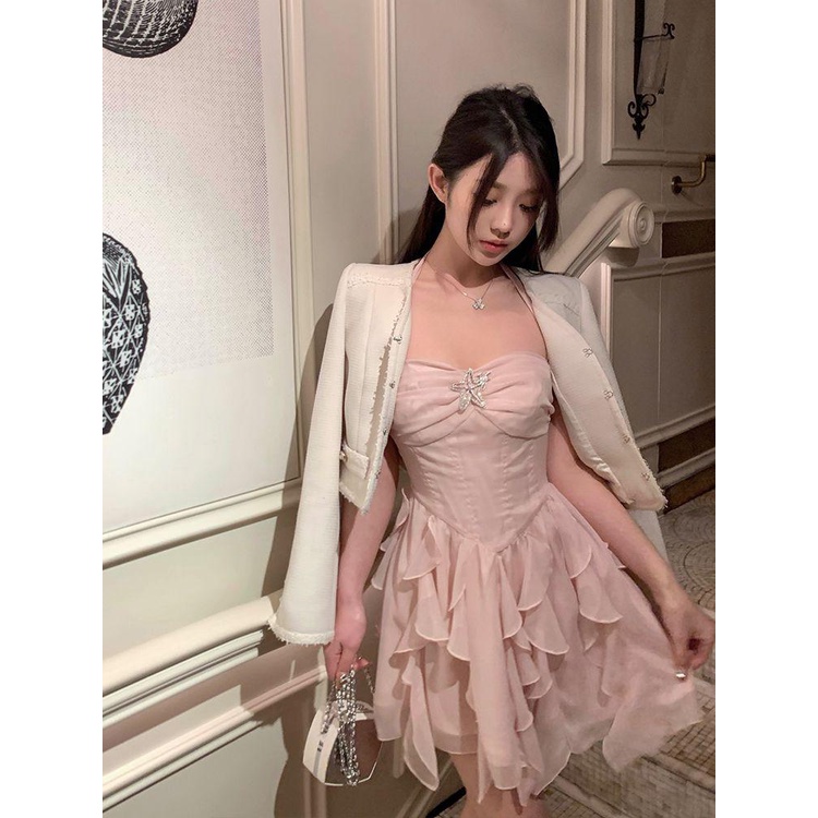 Fashion Muslim > Dress Muslim > Dress Muslim Lainnya > Gaun Ruffle Pendek Wanita, Gaun Halter Lembut Industri Berat, Mewah Ringan