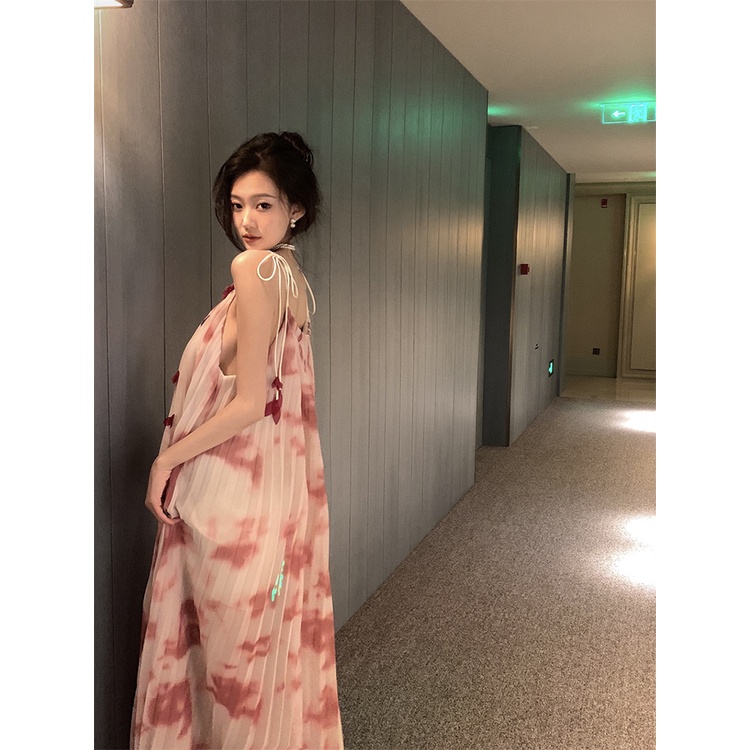 Detail ❏❃♝Gaun suspender high-end tie-dye industri berat Prancis musim panas gaya Hepburn longgar menggantung leher rok peri panjang sedang