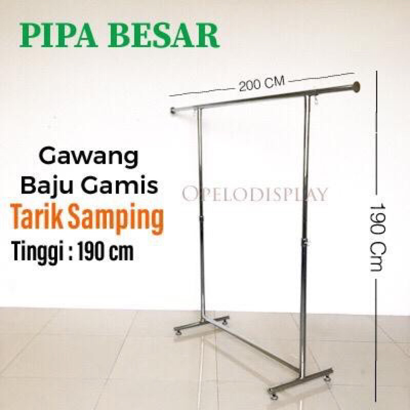 GAWANG BAJU GAMIS PIPA BESAR TARIK SAMPING Gawang ini dapat digunakan untuk menggantung long dress, gamis, kebaya, dsb. Praktis dan bisa dibongkar pasang sehingga bisa dibawa kemanapun.