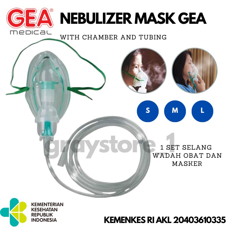 KEMENKES RI AKL 20403610335 Masker nebulizer dari Gea sangat cocok sebagai cadangan / spare utk nebulizer anda. Dilengkapi dengan wadah obat dan selang. Didesign scr universal sehingga dpt digunakan utk berbagai merk nebulizer.