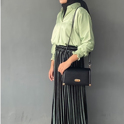 Gea Satin Silk Blouse dengan detail leher v dan tangan unik , model simple dan elegan terlihat mewah karena terbuat dengan material premium “Satin Silk Import”.
