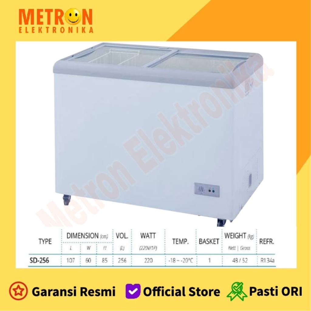 Kapasitas total : Volume : 256L Temperatur : -18 ~ -20°c Konsumsi Daya : 220 Watt Dimensi Produk : 1070 X 600 X 850 cm Berat: 48Kg Kelengkapan Paket1 Unit Sliding Flat Glass Freezer + Buku Garansi