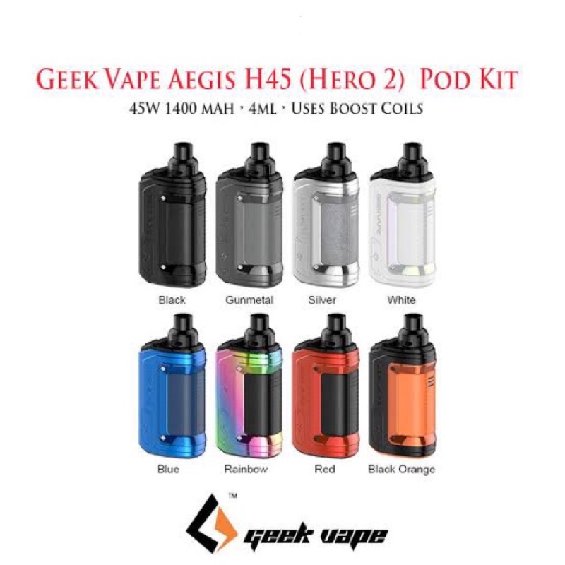 Aegis Hero 2 now comes with new tri-proof. Small in size, rich in flavor. Featuring upgraded metallic shell, more resistant to shock and scratches. 1400mAh battery and bigger display for a better vape experience. 4ml leakproof pod with top airflow system. New Tri-proof Pod Mod All under better protection. Thanks to the new tri-proof technology, Geekvape H45 is now compact and more durable featuring a new metallic shell that is more shock and scratch resistant. Long-lasting Battery Got more to enjoy. Powered by a built-in 1400mAh battery, Geekvape H45 provides a long-lasting vape experience. Stable Output Buck Boost Tech HERO always takes his time. An all-time steady output system optimizes power to provide consistent flavor delivery performance even when the battery is going low. 0.96-inch TFT Display Bigger for better. A larger screen allows for a more immersive visual experience. Together with the new design UI, the vaping info gets more intuitive. Every detail is within vision. Top Airflow with Leakproof Design HERO deserves the best. Top airflow is the ideal partner for leakproof design. The airflow enters via the side inlets, making it easier to reach the coil, resulting in superior flavor and more precise airflow control. Top-mounted filling port makes liquid-refilling for a 4ml capacity chamber simple and prevents leaking. Geekvape B Series Coil Meets all your flavor expectations. Bigger cloud, smoother flavor, and stronger throat hit