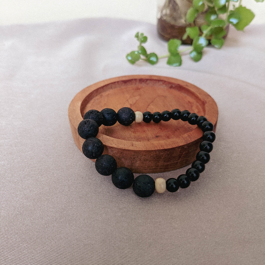 Bahan: - Wood - Natural Stone Lava Black Volcanic - Black Round Pearl - Latex Free Cord
