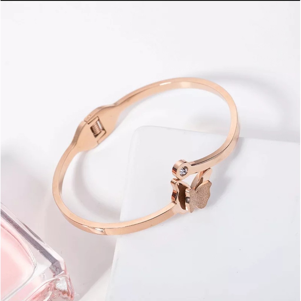 Detail Gelang Bangle Titanium Model Butterfly With Diamond Artificial Tersedia Rosegold, Gold dan Silver