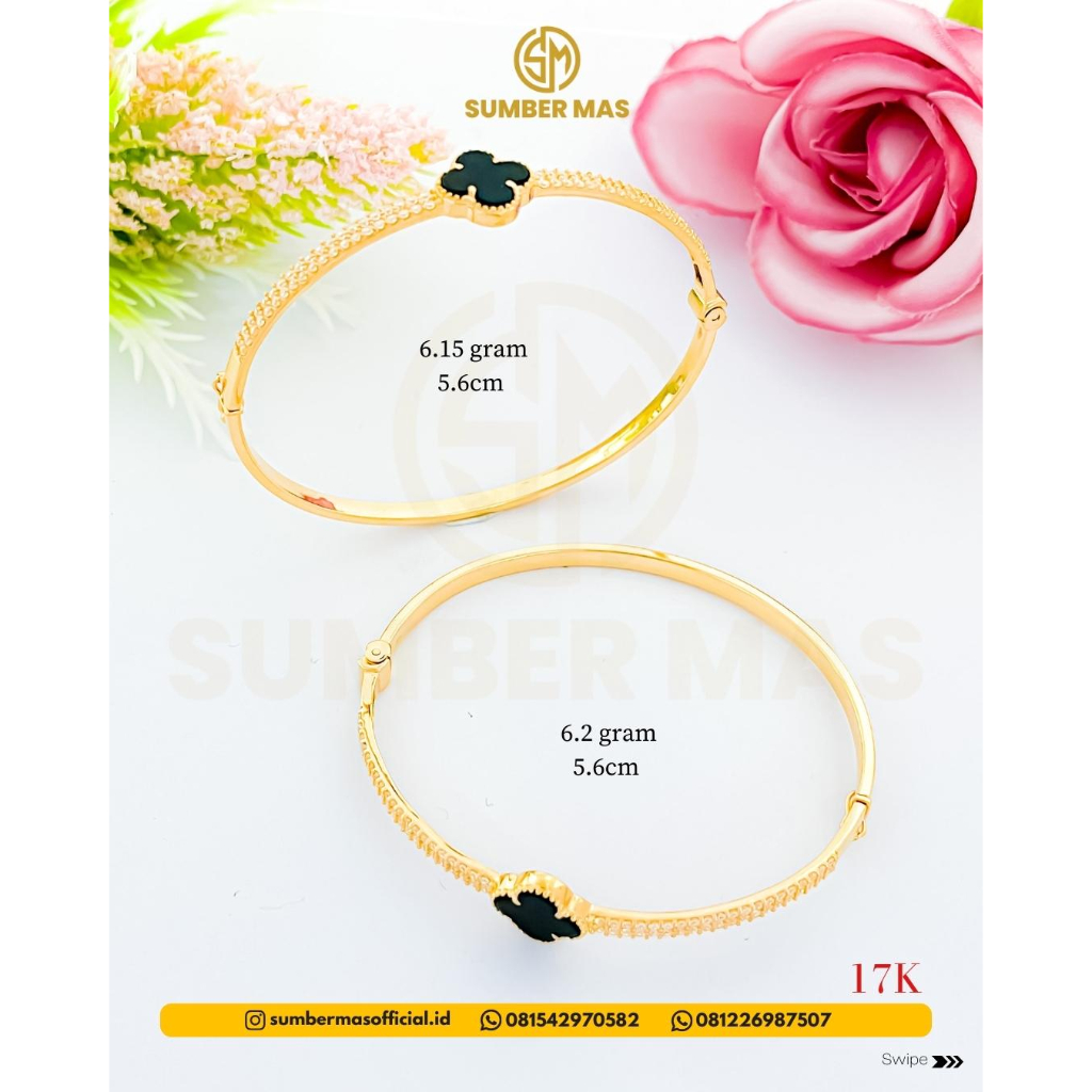 Nama Barang : GELANG BLACK VC FASHION 17K - SUMBER MAS Berat : 6.15 GRAM - 6.2 GRAM Ukuran : 5.6CM Variasi : GOLD Kadar Emas : 17K (750) Keuntungan Membeli Perhiasan di Toko Emas Sumber Mas