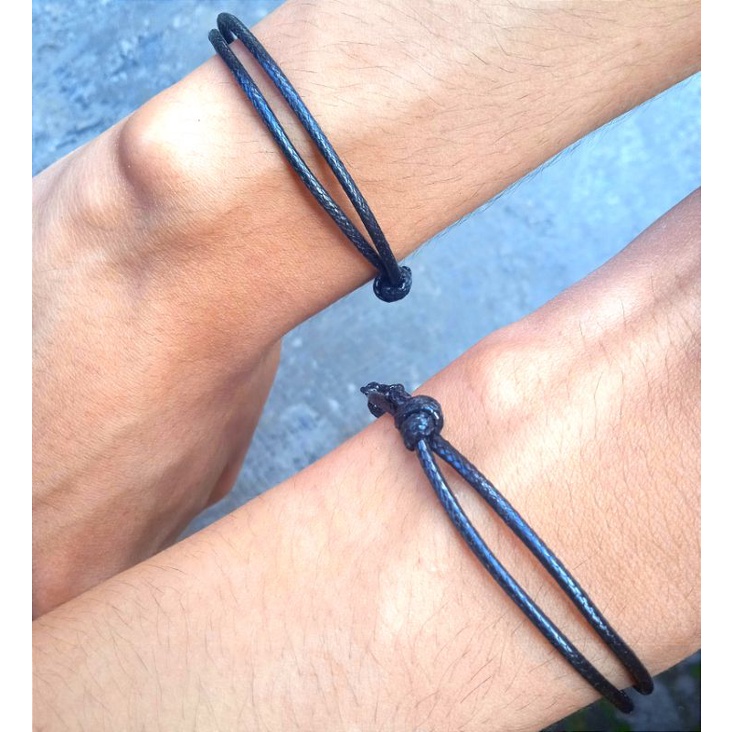 Paket 2 pcs Gelang (Sepasang/Couple) Bahan : Tali Korea Glossy/Berkilau Warna : Hitam Diameter : 1,5 mm Ukuran : Adjustable dapat disesuaikan dengan dilonggar-kencangkan (All Size) kualitas : Import waterproff/tahan air