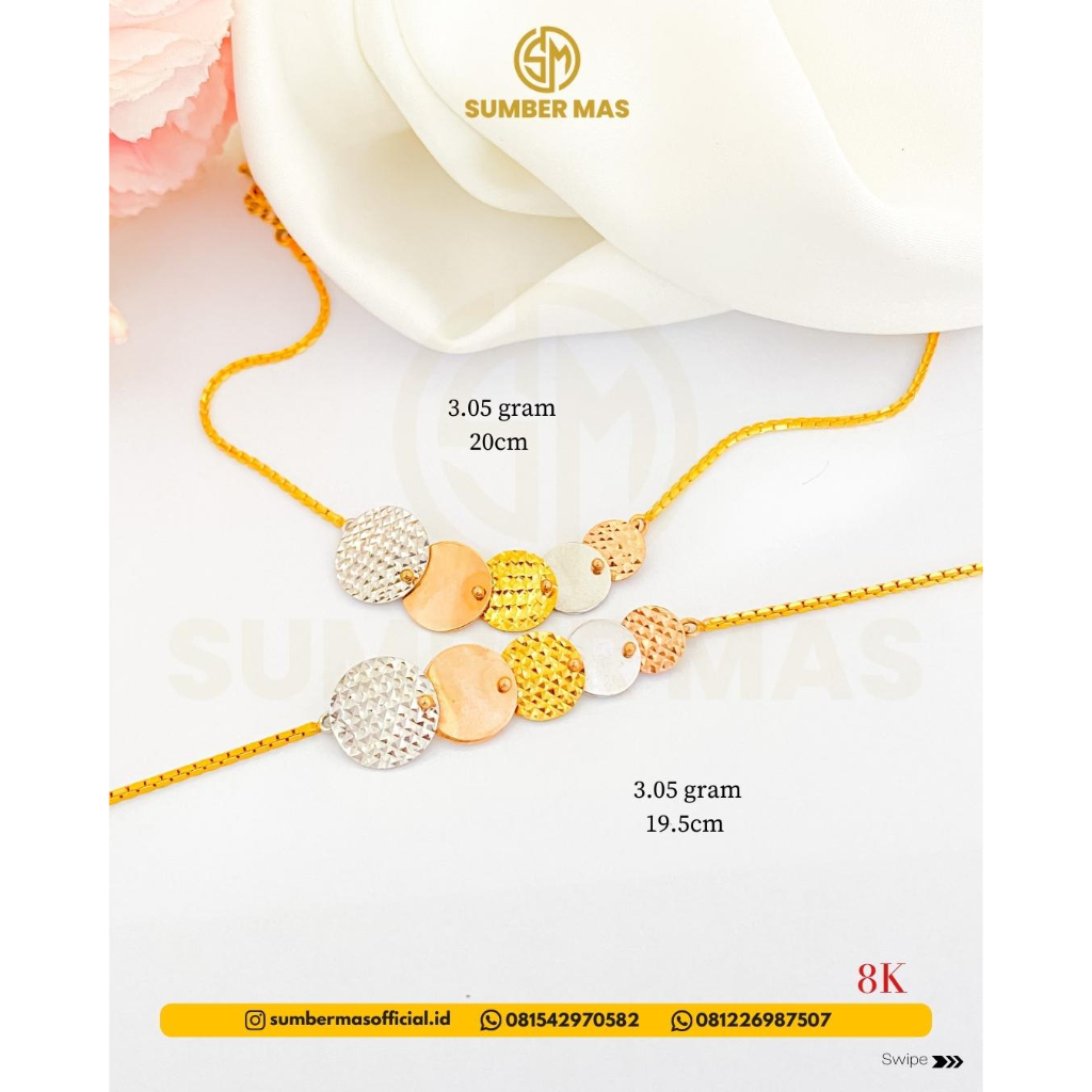 Nama Barang : GELANG FIVE COIN'S FASHION 8K - SUMBER MAS Berat : 3.05 GRAM Ukuran : 19.5CM - 20CM Variasi : GOLD Kadar Emas : 8K (375) Keuntungan Membeli Perhiasan di Toko Emas Sumber Mas