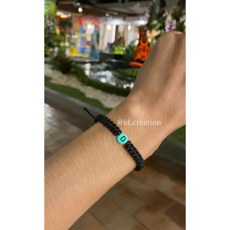 Bahan : - TALI KOREA HITAM 1mm di ANYAM (tahan air dan mengkilap) - Adjustable (bisa dibesar kecilkan) - Material:Acrylic inisial A-Z (BISA NYALA DI TEMPAT GELAP) - Size: 4x7mm - Hole size: 1mm