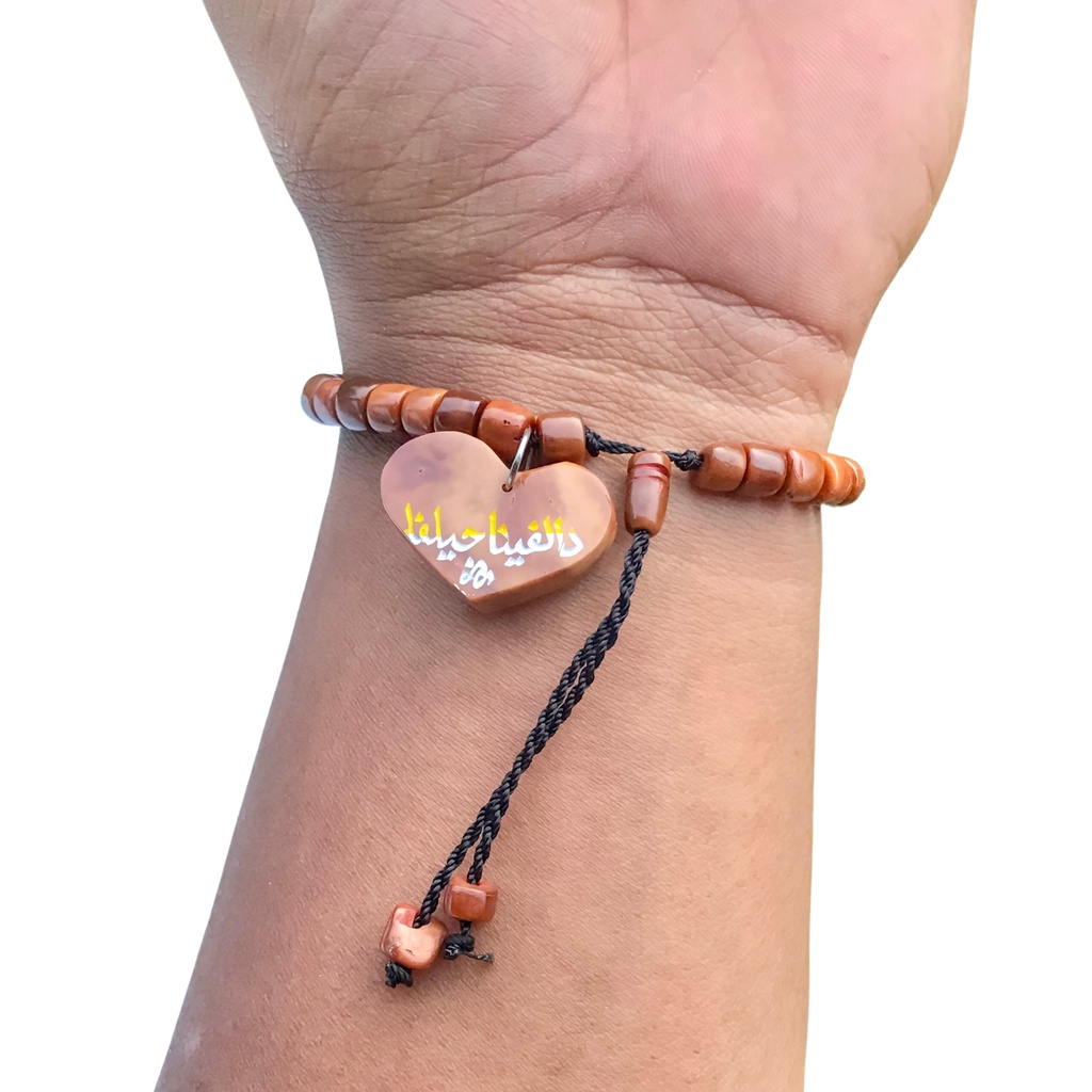 Gelang kokka marjan dengan gantungan love Jumlah butiran gelang ini tepat 33 sehingga dapat menjadi tasbih. Gelang bisa di ukir dengan nama kamu, tanggal lahir, hari jadi, dsbg. ukiran pada love bisa menggunakan huruf Arab, Latin, Angka dll.