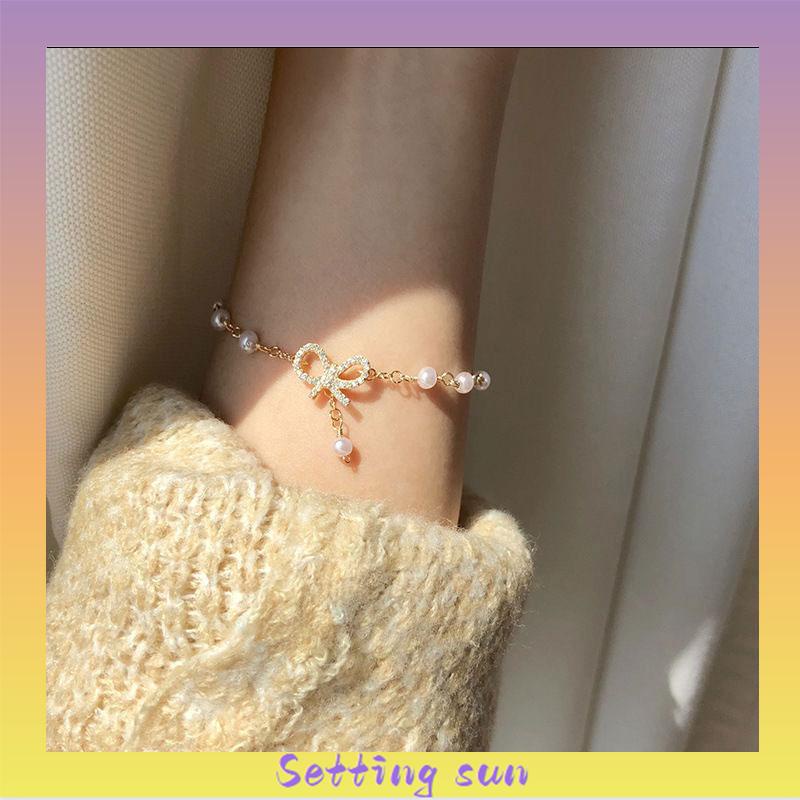 Detail Gelang Korea Fashion Busur Mutiara Hias Berlian Imitasi Bangle Liar Aksesoris Fashion TN