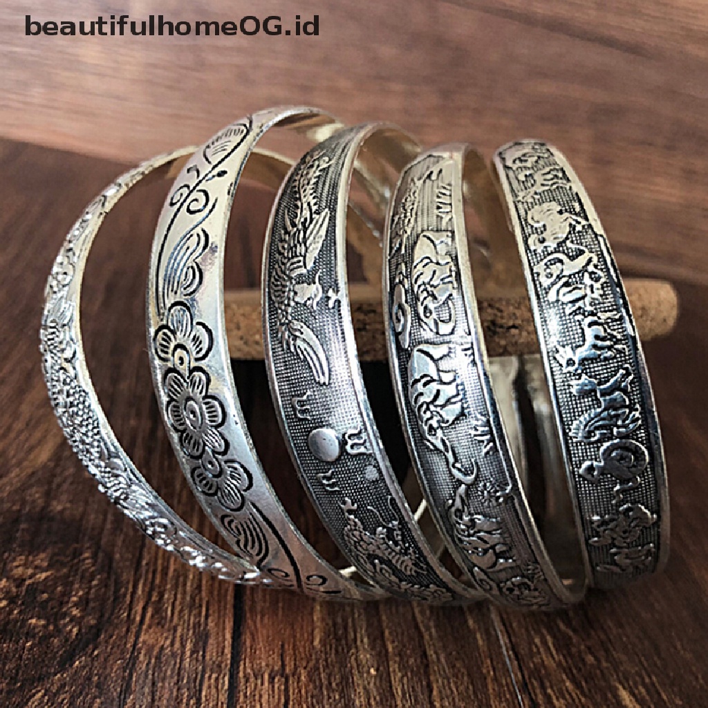 Detail Gelang Model Terbuka Desain Ukiran Totem Warna Silver Gaya Retro Vintage Tibet