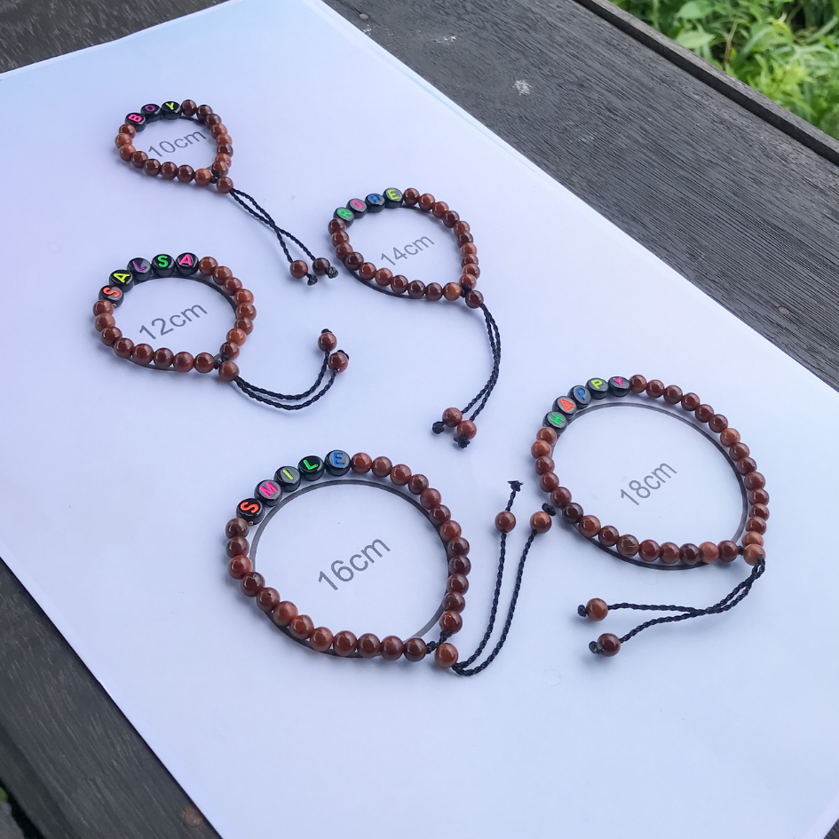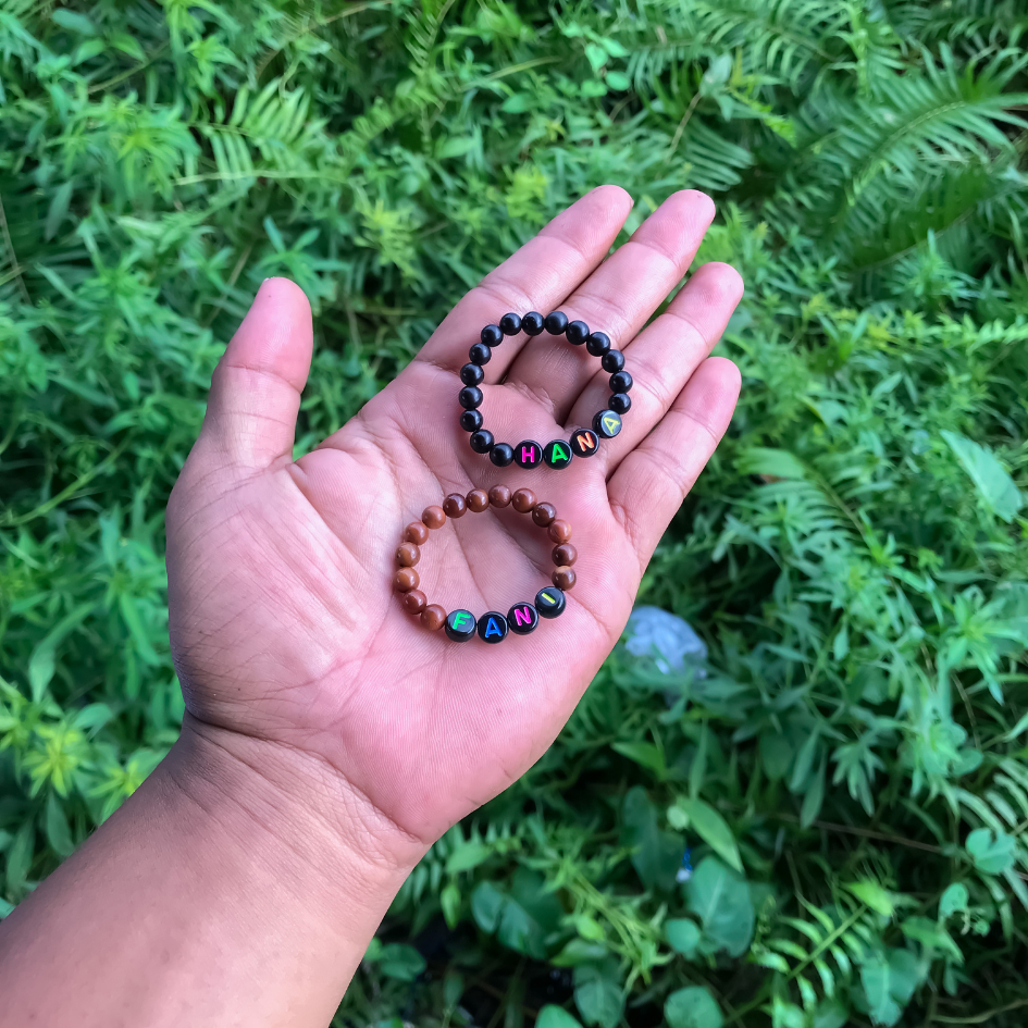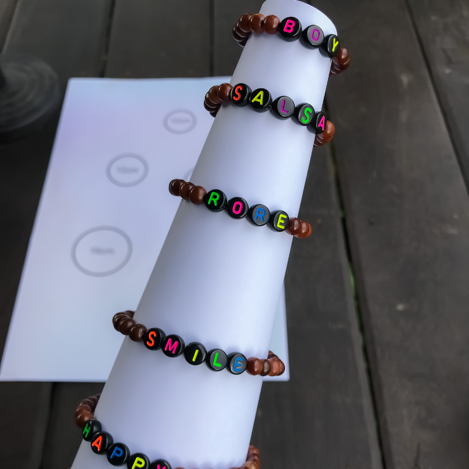 -Nama di gelang menggunakan manik ( bukan kokka ) motif bulat pipih warna hitam tulisan warna warni.
