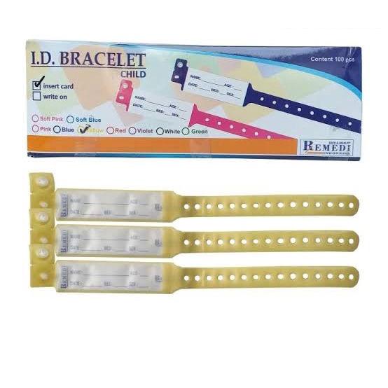 ID Band/ gelang untuk pasien dewasa digunakan di Rumah Sakit/ Klinik untuk menunjukkan identitas pasien. - 1 box isi 100 pcs - Ukuran : Anak - Harga per Box - Warna : Kuning, Biru, Pink