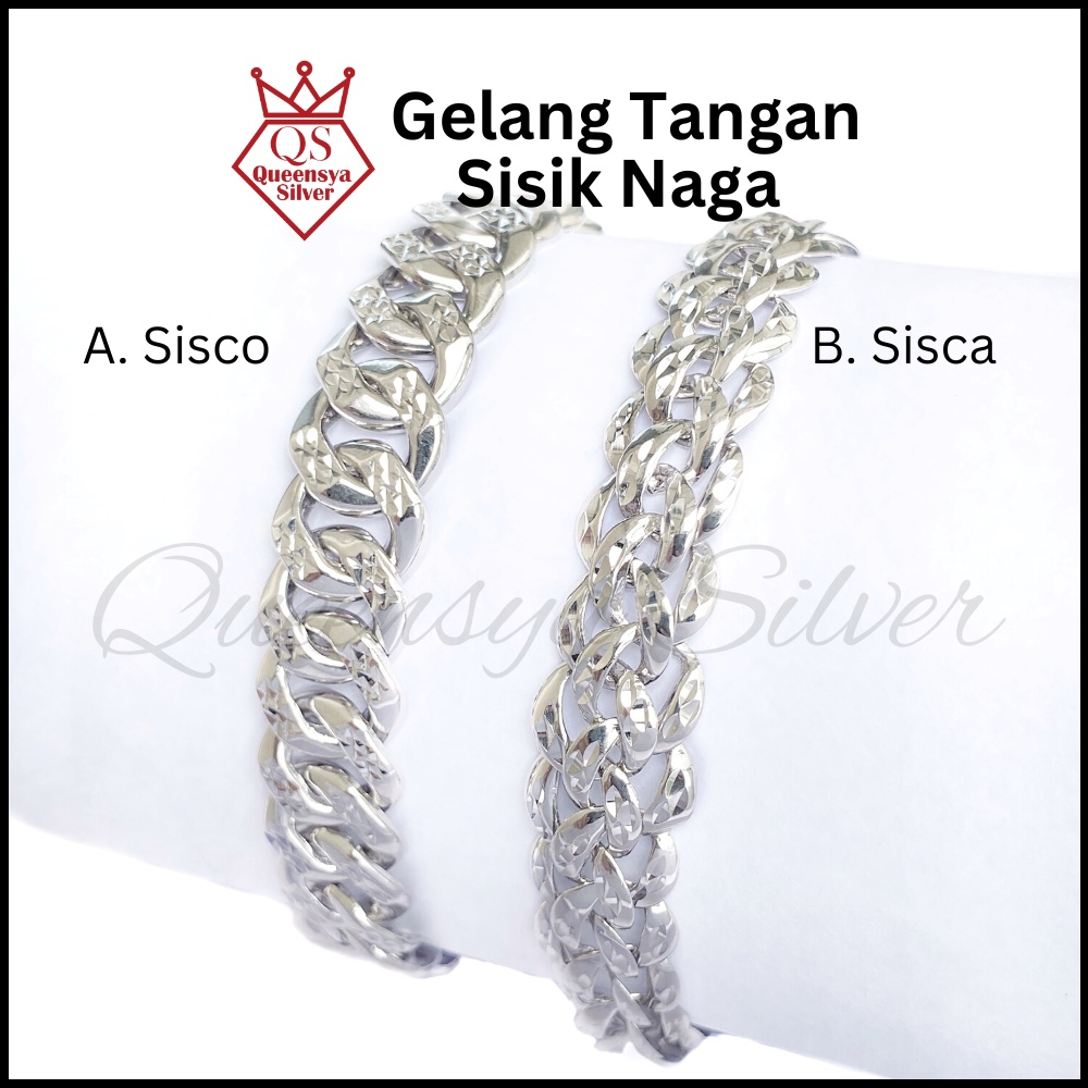 SPESIFIKASI : A. Sisco dan B. Sisca ◌ Jumlah : 1 buah Gelang tangan ◌ Bahan : Perak 925 Sterling Silver Lapis Rhodium ◌ Lapisan : Rhodium ◌ Lebar/Tebal : 10 mm / 2,3 mm ◌ Berat : 9 - 11 gram ◌ Panjang : 17,0 - 18.5 cm (1 gelang ada 2 pemisah ukuran) ◌ Pengukuran dihitung dari angka nol ◌ Ukuran panjang Kalung sudah termasuk dgn kunci/pengaitnya. ◌ Disertai sertifikat dan nota pembelian